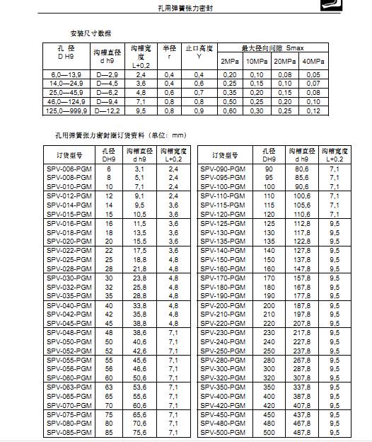 孔用泛塞封尺寸设计表: