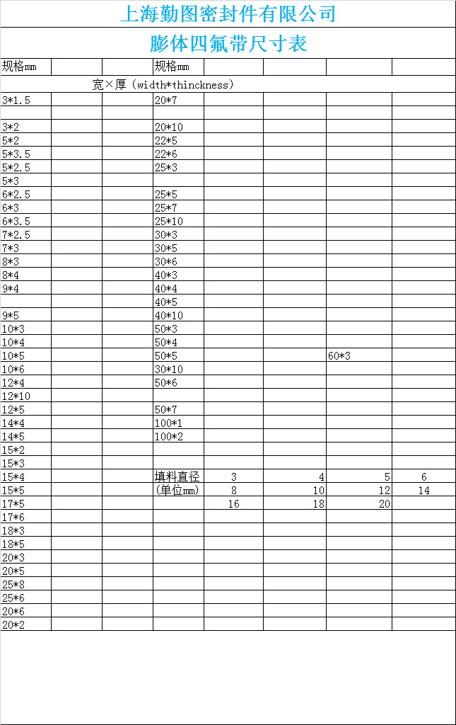 弹性四氟密封带规格尺寸表: